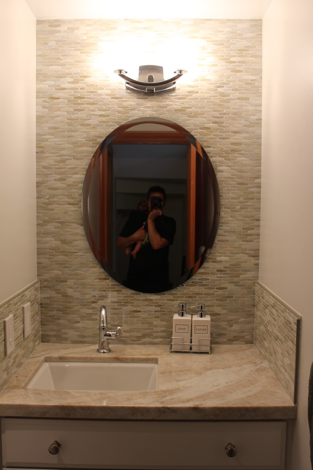 It does work! Wendy has actually debated maybe recovering it in another tile to make it go with the house more, which I am totally in favor of 🙂 Who knows, maybe another tile selection in our future… 🙂