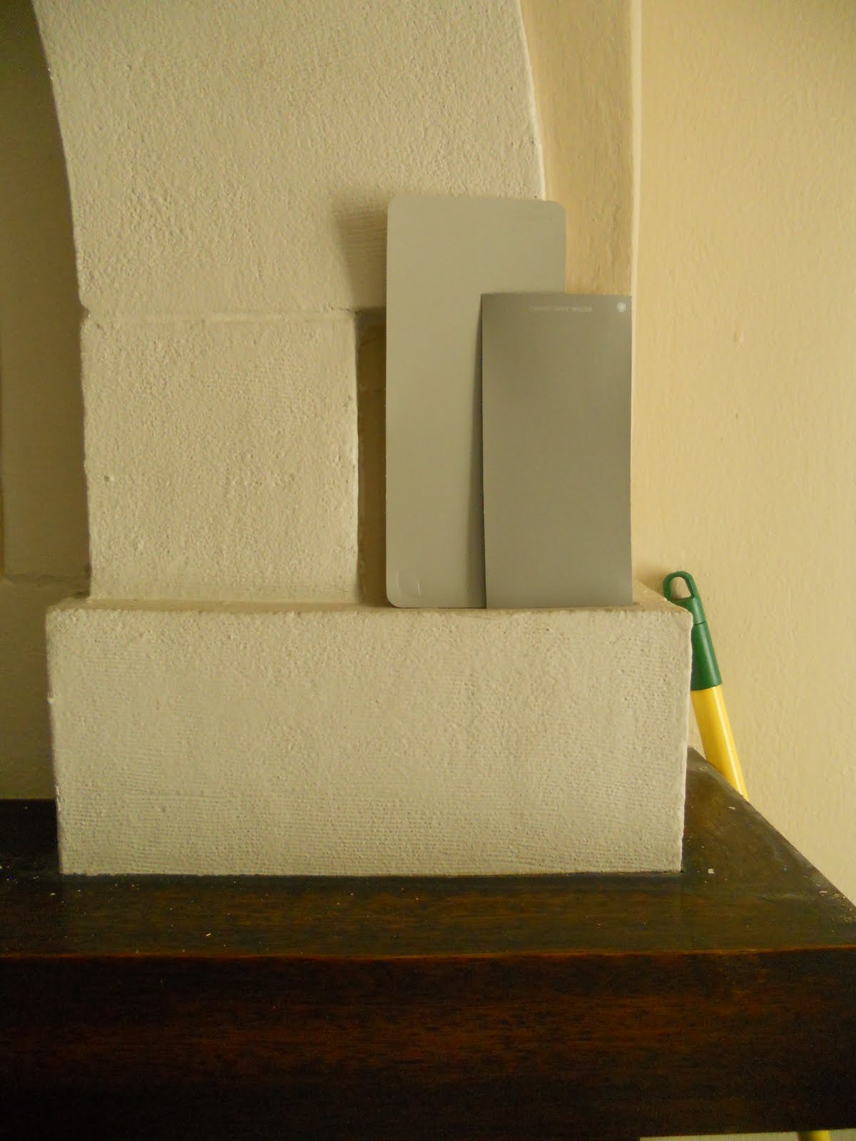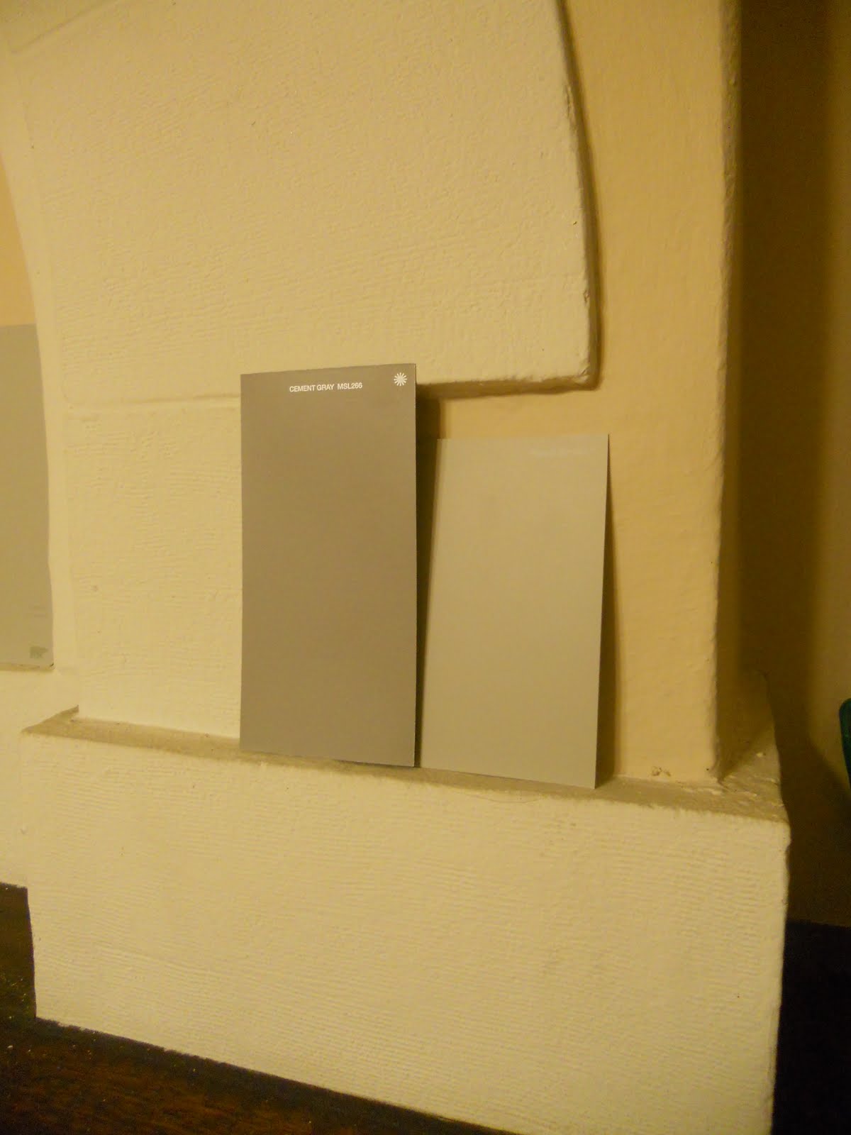 In the evening light I was pretty sure about the Martha Stewart Cement Gray on the left for the darker detail walls (the relief and fireplace), and the lighter Glidden Wood Smoke on the right for the rest of the walls in the room