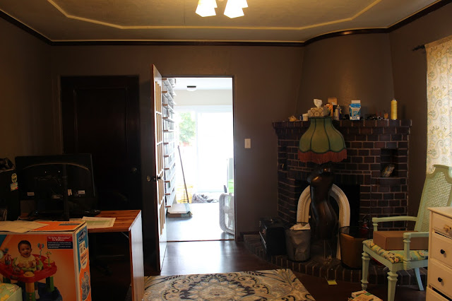 The crappy thing about painting this room was that holy fucking shit there were SO MANY cut ins. There are 4 doors, 3 windows, 2 built in bookcases and a fucking curved fireplace. I was really, really not looking forward to those fucking cut ins. Can you tell? But, alas, that task needed to get done. So I buckled down while just about 39 weeks pregnant and boxed the paint, primed a couple of spots and got started
