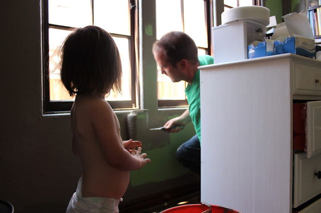 I will say I was really proud of myself for getting the cut ins in this room painted while almost 39 weeks pregnant, but let me tell you, my body was not happy with me that night – I felt like my back was about to be split in two. It was my plan to roll the color on, but Chris came to the rescue the next day and did that for me – thank-my-pregnant-body-god. And of course, Zoe had to help again, duh